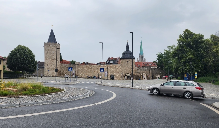 주차장에 차를 세우고, 프라우엔토아로 걸어가다 회전교차로에서 바라본 시의 성벽과 프라우엔토아의 모습.
