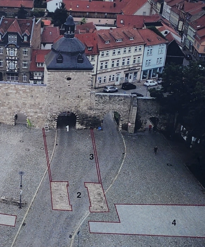 이 말을 이해하려면 안내판을 좀 더 자세히 읽어보아야 할 필요가 있는데, 그에 따르면 옛날 도시의 주요 성문들의 경우와 마찬가지로 프라우엔토아 역시 이중으로 되어 있어서 아래 사진속의 2번부분에 또 하나의 프라우엔토아가 있었다고 한다. 그러니까 지금 우리가 보는 프라우엔토아는 그것 안쪽에 있었던 것이지. 아, 지금은 안보이는 또 하나의 프라우엔토아는 중간을 의미하는 독일어인 mittler를 붙여 Mittleres Frauentor라고 불렀다고 하는데(3번), 그 또한 1830년에 철거되었다고 한다. 그 결과 이제 남아 있는 것은 가장 안쪽에 있던 Inneres Frauentor밖에 없게 됐다는 것이다.