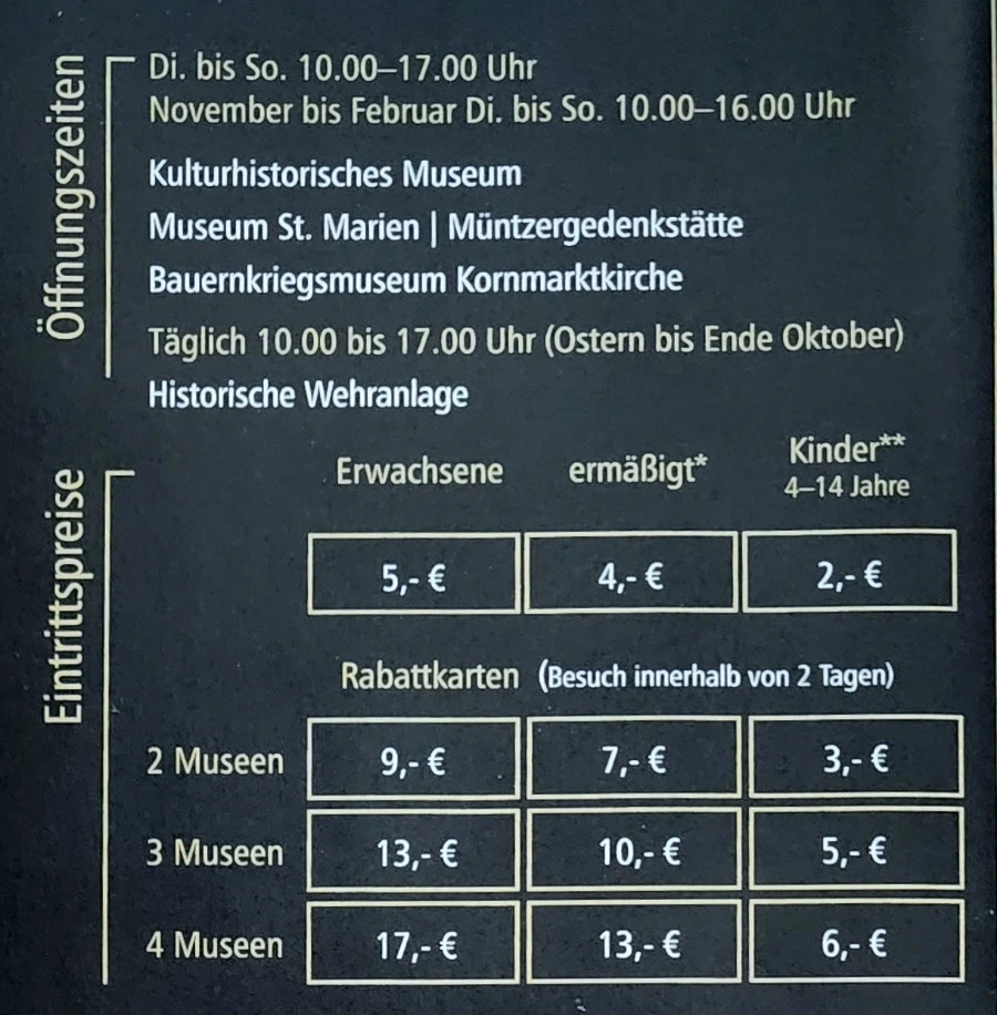 만일에 시내로 들어가 성 마리엔교회 (St. Marienkiche)와 코른마르크트교회(Kornmarktkirche)까지 보고자 한다면, 3곳을 모두 둘러볼 수 있는 티켓을 사는 것이 좋다. 가격은 2023년 6월 현재 성인 개인 기준으로 13유로.