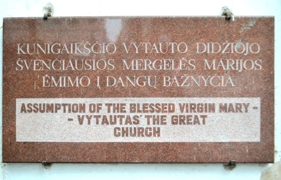 때문에 교회의 내부를 보지는 못했다. 물론 첨탑에도 올라 보지도 못하고. 사정이 이러하니 이 교회에 대해서는 할 말이 전혀 없다. 그저 팜플렛에 있는 말 하나만 적어 놓으면, 교회의 건립은 그 역사가 1400년에까지 거슬러 올라가는데, 리투아니아 대공 비타우타스가 프란체스코 수도사들을 위하여 지어 준 교회라고 한다. 교회 앞에 이런 팻말이 있던데, 정식명칭은 "성모승천 - 비타우타스 교회"네.