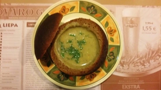이것은 너무도 뻔한 브레드 수프인데, 브레드 수프 자체야 딱히 리투아니아식이라고 할 수 없을 만큼 전 세계에 보편화되어 있는 아이템이기는 하다. 다만 수프를 담고 있는 빵의 색깔이 짙고, 무언가 밀가루 이외에 다른 것을 많이 함유하고 있다는 느낌이 조금 새롭다. 수프 자체 또한 조금 걸쭉한 것이 오트밀을 생각나게 하던데, 어쨌거나 전체적인 평가를 하자면 여기까지는 성공적이라고 할 수 있다.
