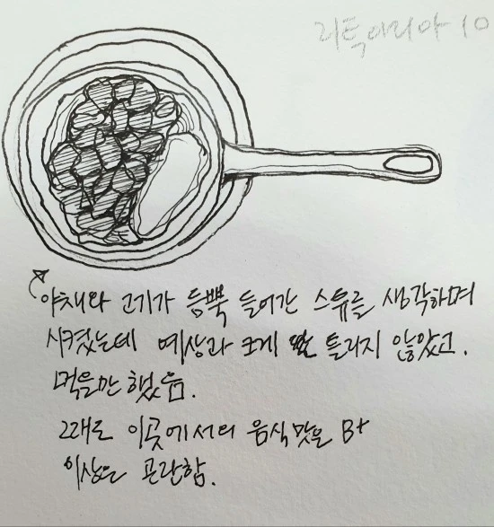 이 둘만으로는 식사가 안될 듯싶어 야채와 고기가 듬뿍 들어간 스튜를 생각하며 한 가지를 더 주문했다. 뭐 예상과 크게 틀리지 않았고 먹을 만도 했는데, 다만 이것저것 야채와 고기를 닥치는 대로 넣었을 뿐, 비주얼은 다소 소홀히 한 듯 하다. 결론적으로 음식의 평가를 함에 있어 보는 맛(비주얼) 또한 중요하다고 여기는 나로서는 B+ 이상은 주기 곤란한 수준이다.