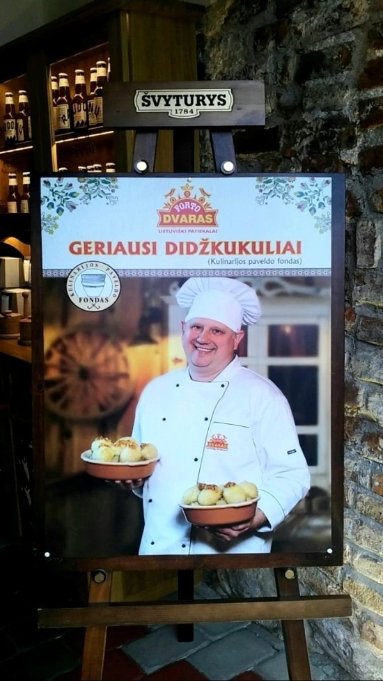 입구에 들어서면 오른쪽으로 Chef 사진이 있는 입간판이 세워져 있다. 어쩌면 전통요리 대회에서 수상한 경력을 갖고 있는 요리사가 Chef로 있다는 것을 알리는 입간판일 수도 있는데, 리투아니아어를 전혀 모르니 그 내용은 알 수 없다. 어쨌거나 Chef 사진을 내 걸고 있는 것에서 약간의 자부심이 느껴졌다.
