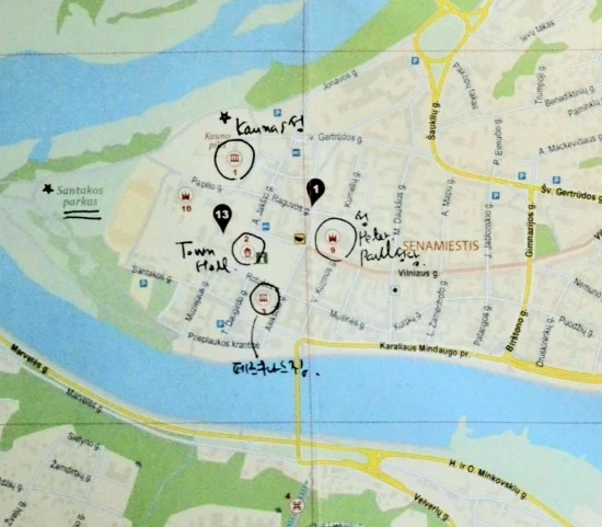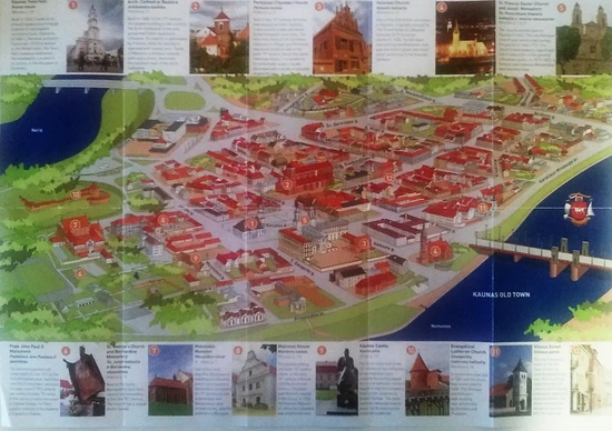 카우나스 구시가지 관광을 효과적으로 하려면 구시가지의 골목골목을 상세하게 보여주는 아래 사진과 같은 지도가 필요하다. 이 지도는 관광안내소에서 제공하는 팜플렛 속에 들어 있는데, 여기에는 보다시피 구시가지에서 꼭 보아야 할 것 베스트 10이 사진과 함께 소개되어 있다. 자, 이제 이 팜플렛을 기초로 카우나스 구시가지 관광에 본격적으로 나서 보도록 하겠다.