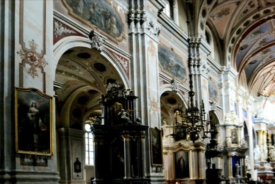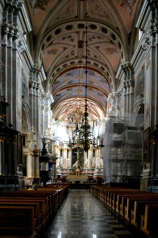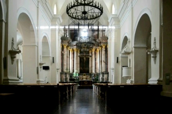 성당 안으로 들어서면 밖에서 보았던 조금은 초라한 모습의 그것과는 전혀 다른 느낌을 주는 화려함이 성당 내부를 지배하고 있다. 비록 오른쪽 기둥과 설교대가 보수작업 중이어서 화려함이 잘 전달되지 않기는 하지만, 중앙 제단으로 이어지는 신랑의 모습과 천장은 충분히 화려하다.