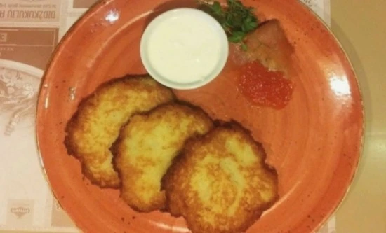 레스토랑에서 제일 중요한 것은 뭐니 뭐니 해도 제공하는 음식의 종류와 그 맛이다. 그러나 리투아니아 전통 음식에 대해서 전혀 모르기도 하고, 리투아니아식 음식이라고 게시되어 있는 사진을 보아도 막상 그리 특징적인 것도 보이지 않아서 메뉴의 설명을 참고로 하여 주문을 했다. 우선 이것은 우리식의 감자전과 비슷할 것이라는 생각으로 주문한 것이었는데, 비주얼은 물론 밀가루를 섞지 않고 감자를 강판에 갈아 만든 느낌을 주는 것이 우리네 감자전과 정확히 일치한다.