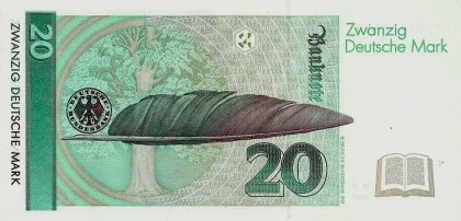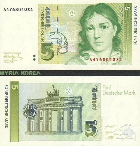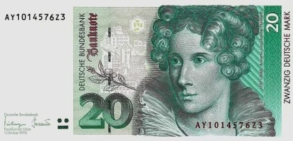 물론 아네테 폰 드로스테-휠스호프 외에도 19세기에 독일에서 활약했던 여류 문인을 더 찾아볼 수는 있다. 그 가운데에서도 베티나 폰 아르님(Bettina von Arnim, 1785~1859)은 상당히 필명이 높고, 사진에서 보듯이 유로가 사용되기 이전 독일의 5 마르크(DM) 짜리 지폐에서도 그 모습을 만날 수 있다. 아, 그녀의 본명 또한(아네테 폰 드로스테-휠스호프만큼은 아니지만) Elisabeth Catharina Ludovica Magdalena Brentano로 상당히 길다. 프랑크푸르트 출신의 베티나 폰 아르님은 자신이 적극 지지했던 1848년의 독일 혁명이 실패한 후 고향에서 은신하다 1859년 베를린에서 사망하게 된다.