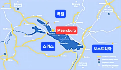 앞에서 이야기한 것처럼 아네테 폰 드로스테-휠스호프는 메어스부르크(Meersburg)에서 삶을 마감하는데, 이제부터 그녀가 죽음을 맞이한 메어스부르크라는 도시와 그 도시 속에 남아 있는 그녀의 흔적을 쫓아가 보기로 하겠다. 사실 메어스부르크는 웬만큼 독일을 안다고 자부하는 사람들에게도 그리 익숙하지 않은 도시, 아니 마을이다. 메어스부르크의 위치는 독일 남쪽에 있는 어마무시하게 큰 호수인 보덴 호수(Bodensee)를 중심으로 이야기하는 것이 편한데... 우선 아래 사진 속의 짙은 푸른색 부분이 독일, 스위스 (CH), 오스트리아(A) 3개국의 자연적 경계선역할을 하고 있는 보덴 호수이고, 메어스부르크는 이 호수의 중간부근에 있다.