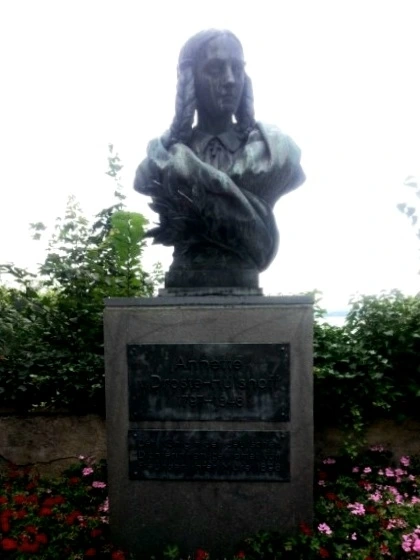 이제야 하는 이야기이지만 사실 나는 메어스부르크를 찾을 때까지, 더 정확히 말하면 아래 사진 속의 동상과 마주치기 전까지 아네테 폰 드로스테-휠스호프라는 여류 문인에 대해서는 그 존재조차 모르고 있었다. 그런데... 신성을 둘러보고 지금은 박물관으로 사용되고 있다는 구성을 향해 계단을 내려가고 있던 내 눈에 세월의 흐름을 느낄 수 있는 흉상 하나가 범상치 않은 모습으로 서있었다. 일단 사진 한 장을 찍고 가까이 다가가 아네테 폰 드로스테-휠스호프라는 이름을 확인하기는 했지만, 그 당시에는 너무도 생소한 이름이어서 별다른 관심이 생기지 않았었다. 그런데 우연찮은 기회에 그녀에 대해 조금 알게 되었고, 그를 바탕으로 하여 지금 이 글을 쓰고 있다. 글쎄, 아네테 폰 드로스테-휠스호프와의 운명적 만남을 운운하면 좀 지나친 것이 되려나.