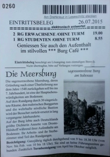 메어스부르크의 구성은 아직도 개인이 소유하고 있고, 지금은 박물관으로 사용되고 있다. 그리고 성안의 모습을 보기 위해서는 입장료(2018년 기준으로 9.5유로, 학생할인을 받아도 8.55유로)를 내고 입장권을 구입하여야 한다. 아래 사진과 같이 입장권이 좀 큰데, 입장권에는 "메어스부르크는 그 기원이 1548년을 넘어 7세기까지 거슬러 올라가는 보덴호숫가에서 가장 볼만한 도시이다"라고 쓰여 있다. 그러니까, 1548년에 이르러서야 무언가 확실한 기록이 있고, 신화스러운 이야기까지 다 고려하면 7세기에 이 도시가 건설되었다... 뭐 이런 이야기이지 아닐까 싶다. 아, 이 글을 쓰기 위해 검색해 보니 지금은 입장료가 무려 12.80유로이다.
