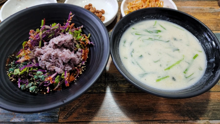 함께 제공되는 다슬기국은 다슬기가 들어있기는 하지만, '다슬기국'보다는 맛으로 보나 비주얼로 보나 약간 묽은 들깨죽 필이 강하다. 다슬기와 부추가 담뿍 담긴... 다슬기비빔밥 + 다슬기국을 함께 사진에 담아 보면 이렇게. 아, 다슬기비빔밥과 논고동비빔밥은 비주얼이 거의 똑같아서, 논고동비빔밥은 따로 사진을 남겨놓지 않았다.