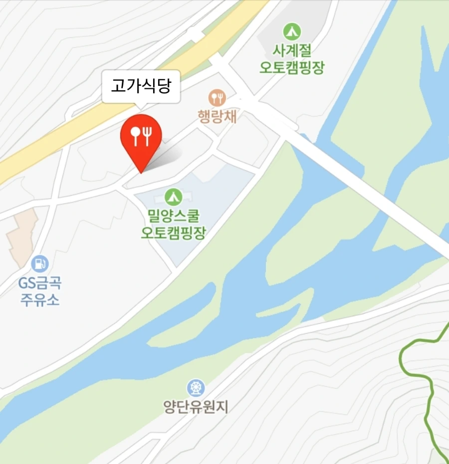 고가식당의 위치? 밀양의 유명한 물놀이 공간으로 알려져 있어서 많은 사람들이 캠핑을 하러 몰려오는 단장천(丹場川)이란 곳이 있는데(아래 사진 참조),