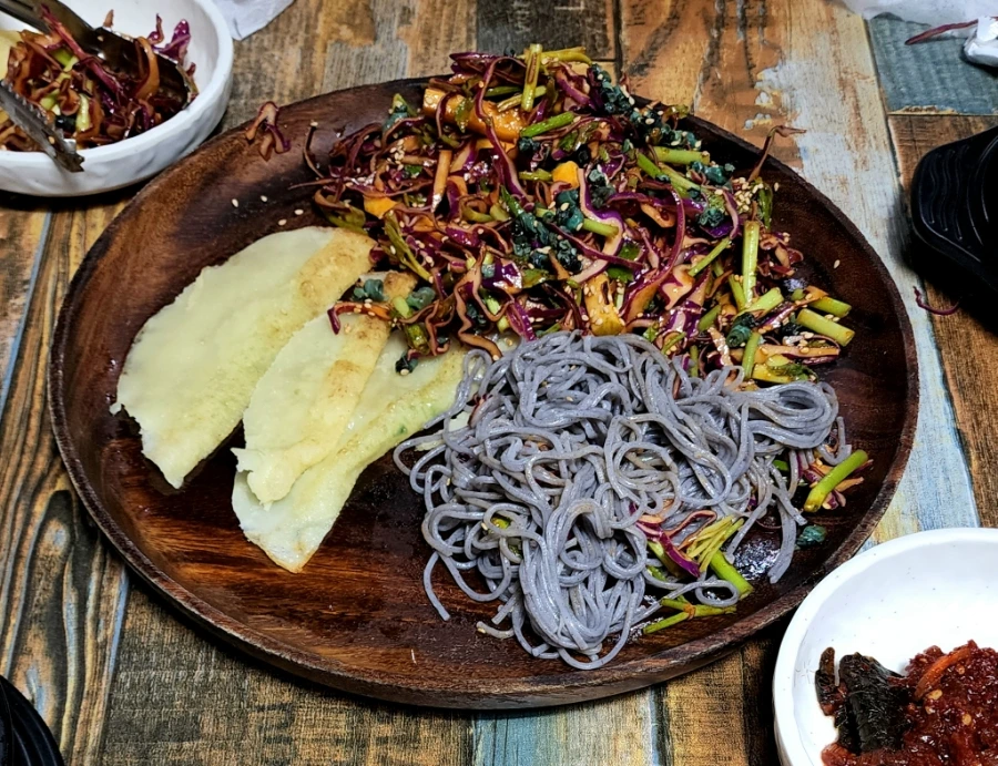 젊은 처자 둘이 앉아 있는 테이블 위에 올라가 있는 다슬기 회무침 또한 참으로 맛있어 보였는데, 이미 식사를 한 후라 맛보지는 못했다. 사진에서 보는 것처럼 납작만두와 소면(?)이 함께 서비스되는 것이 특이한데, 젊은 이들의 취향을 저격하는 메뉴인 듯하다. 개인적으로는 이 음식을 메뉴에 쓸 때는 "다슬기 회무침. Feat: 납작만두 + 소면)"라고 쓰면 어떨까 싶었다는...
