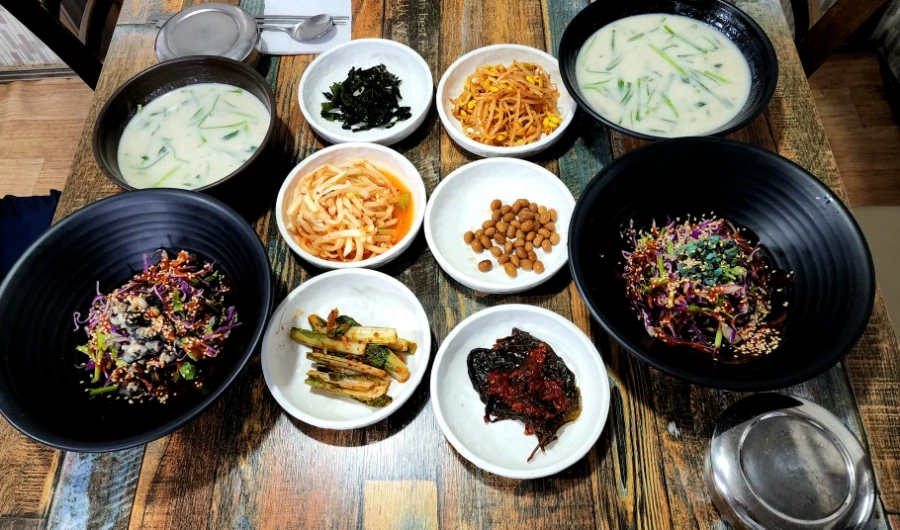 다슬기비빔밥과 논고동비빔밥의 합체, 그리고 기본적으로 제공되는 반찬들이 빚어내는 모습.