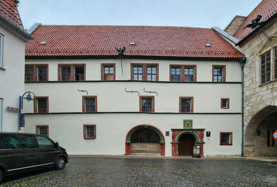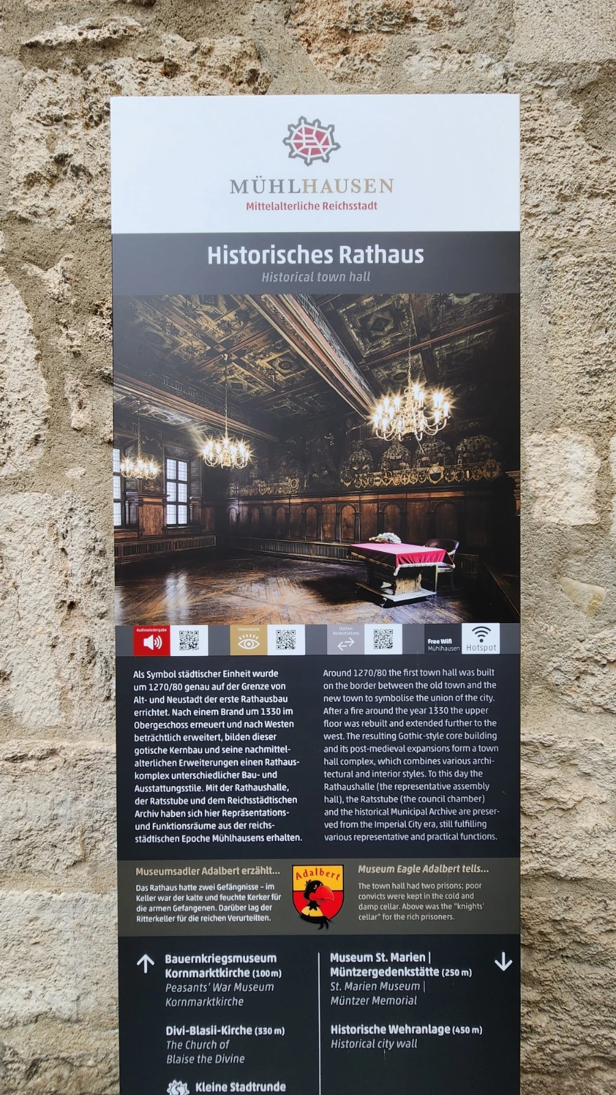 입구 오른쪽에 안내판이 세워져 있는데, 그에 따르면 시청사가 처음 지어진 것은 1270/80년이고, 화재를 입은 후인 1330년에 윗층이 새로이 축조되었다고 한다. 그렇다면 이 건물의 역사는 900년을 훌쩍 뛰어 넘는다는 이야기가 된다. 한편 안내판은 '역사적 의미를 갖는(historisch)' 시청사를 강조하고 있는데, 그에 대해서는 뒤에서 다시 이야기 하겠다.
