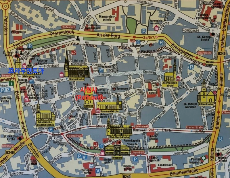 유럽의 도시들 중 오랜 역사를 가진 도시들은 거의 예외없이 시청사(Rathaus) 자체가 볼거리로 꼽힌다. 그도 그럴만한 것이 시청사가 지어질 당시에는 시청사가 세속 건물로는 그 도시에서 가장 그럴싸하게 지어지기 마련이고, 시간이 흐르면서 거기에 역사성이 더해지기 때문이다. 그리고 그런 점에서는 뮐하우젠(Mühlhausen) 또한 예외가 아니다. 하여 뮐하우젠 시청사를 찾아 나게 되었다. 뮐하우젠 시청사는 아래 지도에서 보듯이 도시의 한복판, 그것도 정확히 신도시와 구도시의 경계지점에 있다. 그리고 이때문인지는 몰라도 뮐하우젠의 시청사에 대해서는 시청사가 도시 통합의 상징이라는 설명이 행해지고 있다.