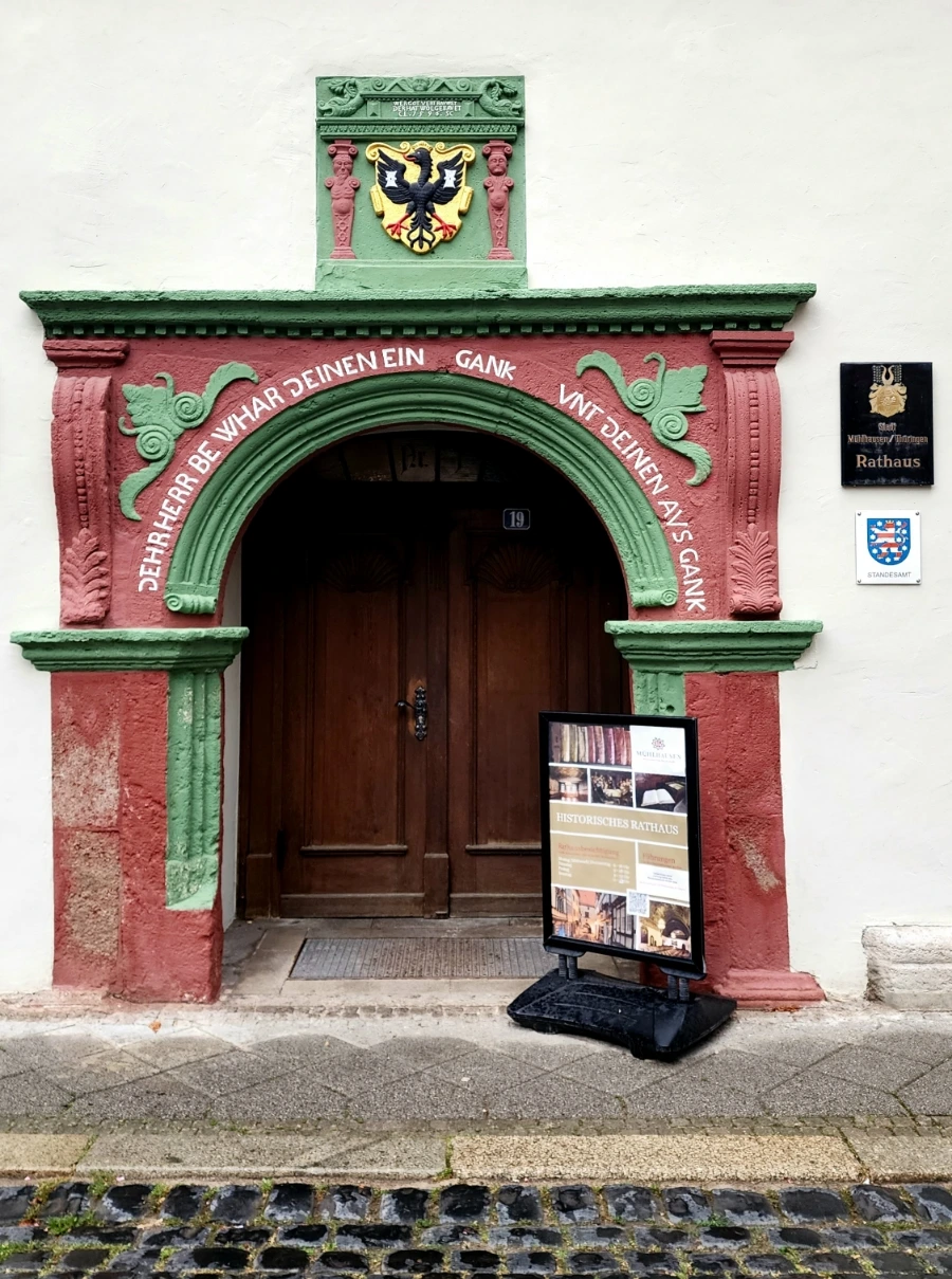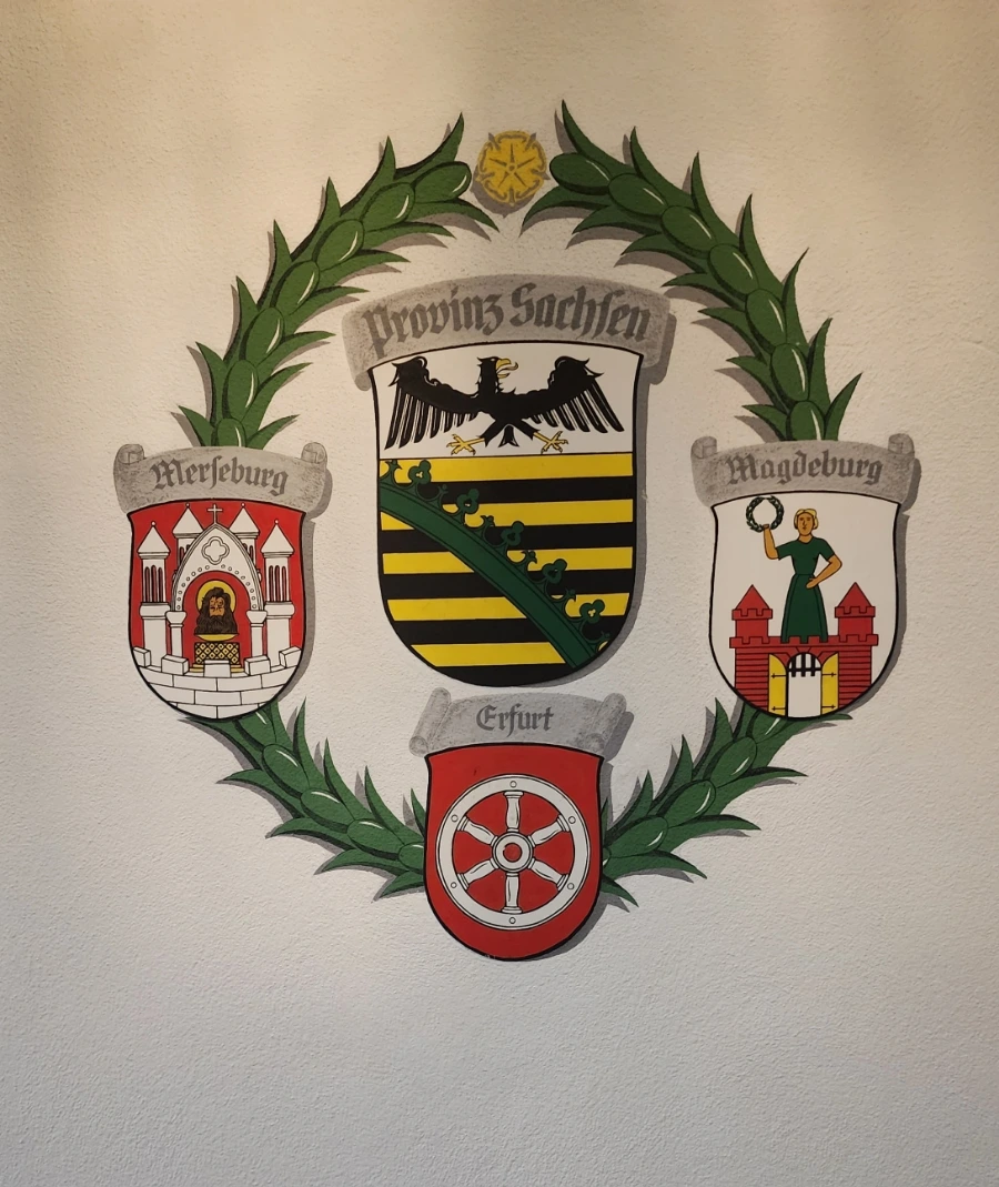시청사안으로 들어갔을 때, 제일 먼저 눈에 들어 온것은 벽에 붙어 있는 이것이었다. 왼쪽의 메르제부르크(Merseburg)와 오른쪽의 마그데부르크(Magdeburg)는 작센-안할트(Sachsen-Anhalt)주의 도시들이고, 아랫쪽의 에어푸르트(Erfurtfdf)는 튀링엔주의 도시인데... 이들 도시들이 모두 한때는 작센의 깃발 아래 있었음을 나타내고자 하는 것인가? 재미있는 것은 정작 뮐하우젠은 저 그림 속에 없다는 것이다.