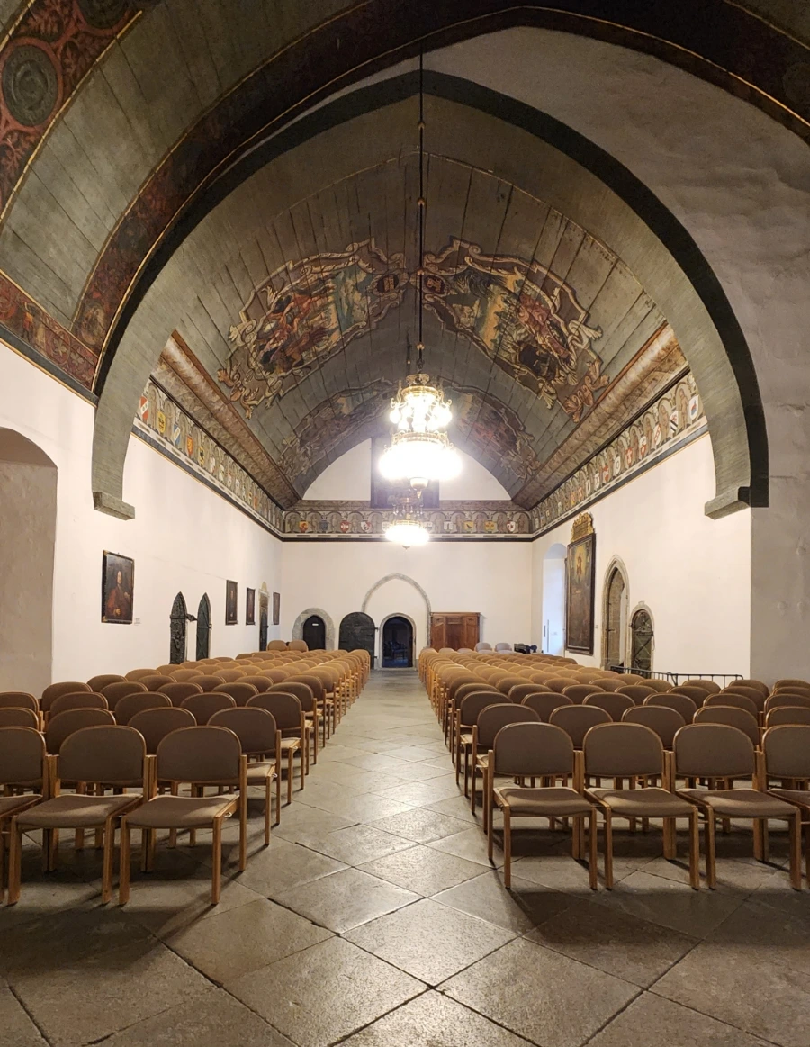 한쪽 벽면에 이방의 역사를 알려주는 내용이 적혀 있다. 그에 따르면 이 방은1370년에 지어졌고, 1460년과 1571-72년에 벽화 등이 그려졌고, 1913-14년에 보수 및 복원이 이루어졌다.