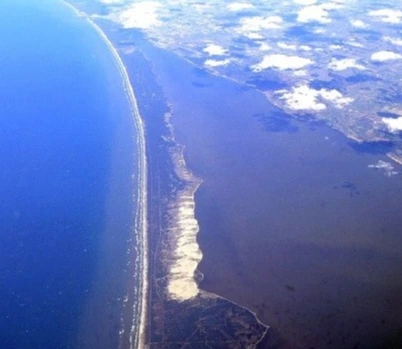 쿠르슈 사주를 위의 사진처럼 그저 적당히 기다란 모래언덕이라고 생각한다면, 그건 그야말로 큰 착각이다. 만약 쿠르슈 사주가 그 정도라고 한다면, 그를 보려고 전 세계에서 관광객들이 수도 없이 몰려오지는 않을 것이다. 물론 유네스코가 이를 세계문화유산으로 지정하는 일도 없었을 것이고. 쿠르슈 사주는 폭 0.4km~4km에, 길이 98km에 이르는 상상 이상의 거대한 모래언덕인데, 말로써는 느낌이 잘 안 올 테니 하늘에서 잡은 쿠르슈 사주의 모습(그것도 일부)을 보여 주도록 하겠다. 아, 98km면 대략 서울에서 천안에 이르는 정도의 거리이다.