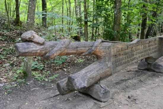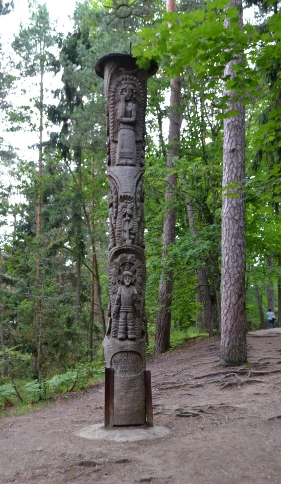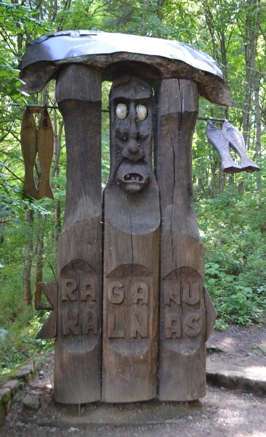 어찌 되었든 간에 위의 작품을 시작으로 해서 언덕 전체를 이들 나무조각이 뒤덮고 있는데, 하나같이 약간은 기괴한 모습들을 하고 있다. 아래 사진은 꼬챙이에 꽂혀 있는 물고기의 모습에서 문득 과메기 모습이 떠올라 찍어 둔 것인데, 이 글을 쓰다 보니 작품 아랫부분에 마녀의 언덕( Raganu Kalnas)이란 글자가 선명한 것이 눈에 띈다.