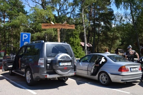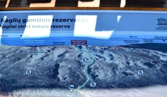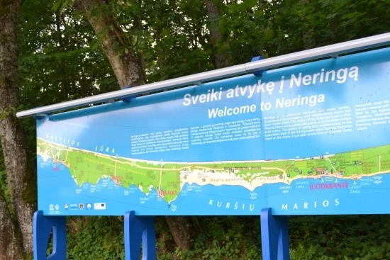 파친티니스는 페리에서 내려 남쪽으로 차를 몰아가다 보면 니다보다 근 10여 킬로미터 전에 있다. 문제는 도로변에는 파친티니스를 알리는 커다란 표지판이 없다는 것, 그래서 웬만큼 주의를 기울이지 않으면 아래 사진과 같은 주차공간을 그냥 지나치기 쉽다는 것이다. 사실 Pažintinis로 시작하지 않고 모래 언덕을 뜻하는 리투아니아어인 "NAGLIU"로 시작하는 표지판을 자동차를 운전하면서 발견하는 것은 결코 쉬운 일이 아니다.