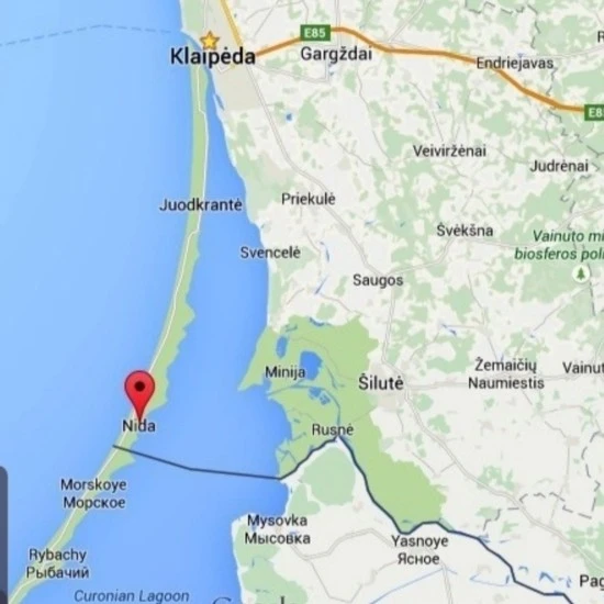 일단 지도 왼편에 발틱해를 둘로 나누며 가로지르고 있는 기다란 모습의 육지가 보일텐데, 그것이 바로 쿠르슈 사주이다. 그리고 쿠르슈 사주 중간 부분에 내가 목적지로 찾아 놓은 '니다(Nida)'라는 곳 밑으로 푸른색 실선이 보일 텐데, 그것이 리투아니아와 러시아의 국경선이다. 그리고 국경선 밑은 러시아가 리투아니아의 독립을 허용하면서도 끝내 반환하지 않아 여전히 러시아령으로 남아 있는 칼리닌그라드(Kaliningrad)이다.