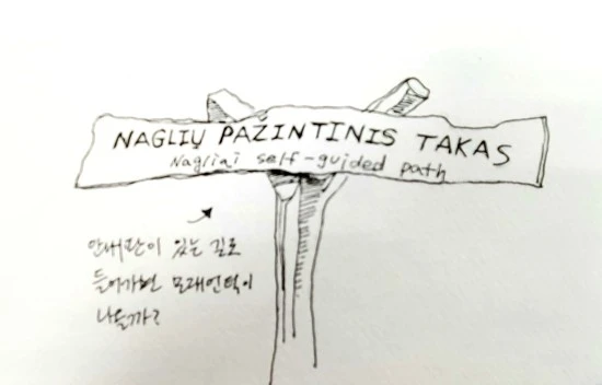 어찌 되었거나 이 표지판을 한가롭게 바라볼 수만 있다면 파친티니스를 제대로 찾아온 것인데, 안내판상의 유일한 영어인 "self-guided path"라는 말이 조금 섬찟하다. 세상에나 "가이드해 줄 사람은 없소. 그렇지만 바닷가 모래 언덕까지 가는 길은 맞소. 그러하니 알아서 걸어갔다가 오쇼"라니... 참 진절한 리투아니아 사람들이다.