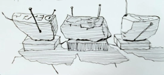 모습도 그렇지만, 셋으로 나뉘어 있는 것이 메뚜기를 생각나게 했던 작품이다. 완전히 기억 속에서 사라진 줄로만 알았는데, 이것을 보는 순간 메뚜기가 머리 - 가슴 - 배의 3 부분으로 이루어져 있다고 설명하시던 중학교 시절의 생물 선생님이 생각나서 스스로도 깜짝 놀랐다. 근 50년 전의 이야기가 유오드크란테에서 다시 기억의 수면 위로 떠오를 줄이야 내 어찌 상상이나 했겠는가? 그러고 보니 여기저기 박혀 있는 쇠몽둥이(?)들은 여지없이 메뚜기의 다리와 날개모습이다.