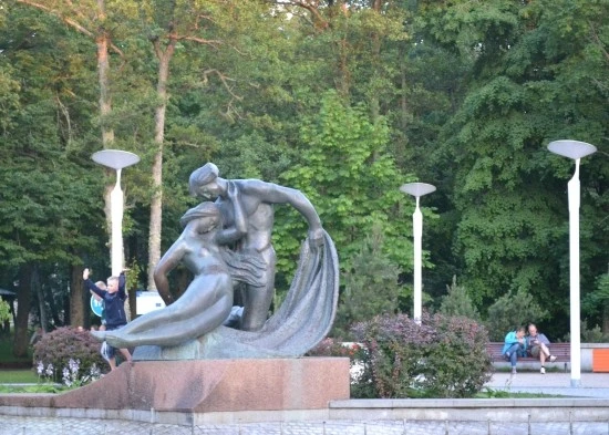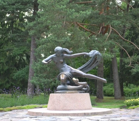 팔랑가 식물 공원 입구(위의 지도 오른쪽 끝 중앙)에서 호박 박물관(지도 중앙의 연못 옆)까지의 거리만도 실로 엄청나다. 한참을 걷고 또 걸은 후에 아래 사진과 같은 역동성이 돋보이는 멋진 조각상을 만난다면, 이제 절반은 걸어온 셈이다. 조각상의 주인공? 확실하지는 않지만 리투아니아 전설 속의 여신 유라테(Yurate)처럼 보인다.