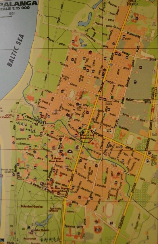 팔랑가, 특히 볼거리가 몰려 있는 중심지는 너무나도 뻔해서 팔랑가 관광에 나서는 경우 지도는 사실 별로 필요 없지만, 일단 지도를 가지고 이야기를 해 보겠다. 우선 지도 왼쪽에 발트해(Baltic Sea)가 보일 텐데, 그 발트해를 따라 길게 노란색과 회색으로 표시된 부분이 18km씩이나 이어지는 팔랑가의 해변이다.