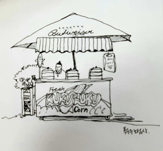 내가 이 거리에서 제일 먼저 눈길을 준 것은 길가에 즐비하게 늘어서 있는 옥수수를 쪄서 파는 노점들이었다. 순간적으로 옥수수가 리투아니아를 대표하는 농작물인가?라는 의문이 들 정도였는데, 기억의 저장창고를 아무리 헤집어 보아도 리투아니아의 다른 도시들에서 이런 장면과 마주친 적은 없었다. 심지어 팔랑가의 경우도 다른 거리에서는 이런 장면과 마주친 일이 없었는데, 그래서 내가 내린 결론은 "옥수수 노점상들이 이렇게나 많이 들어선 이유는 역시 여기가 바사나비츄스 거리이기 때문이다".