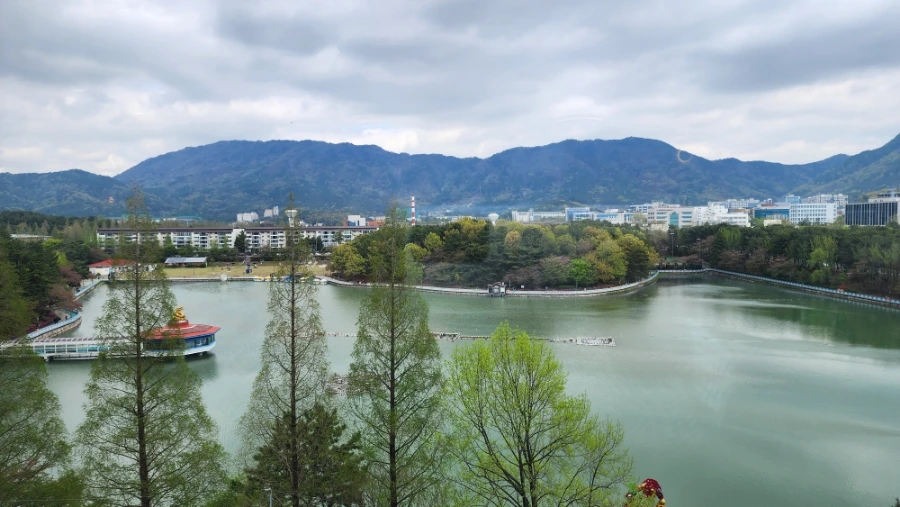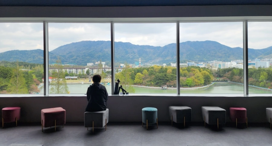 저 자리에 앉으면 무엇이 보이길래 저렇게 자리를 배치했냐고? 그야 볼 것도 없이 용지호를 품은 이런 풍경이 보인다. 물론 용지호를 즐기려면 창가 바로 앞의 자리가 최적이지만, 주말이면 저 자리는 비어있는 경우가 거의 없다고 한다.