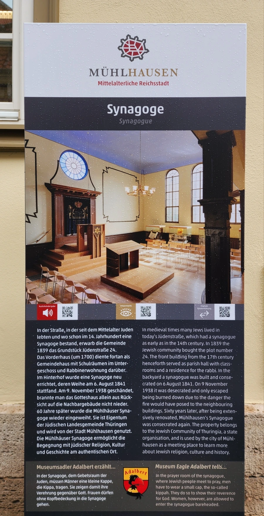 이렇게 시나고그를 찾아 왔건만 나는 건물안으로 들어가 시나고그의 내부를 보지는 못했고, 기껏해야 시나고그 앞이 안내판을 통해 사진으로 내부 모습을 본 것이 전부였다. 왜냐하면 아래 사진 속의 안내판에서 보다시피 이곳의 시나고그는 월요일과 목요일에만 오픈하는데, 내가 이 곳을 찾은 날이 금요일이었기 때문이다. 아, 월요일과 목요일 이외에도 내부 관람이 가능하기는 한데, 그를 위해서는 사전예약이 필수라고 한다.