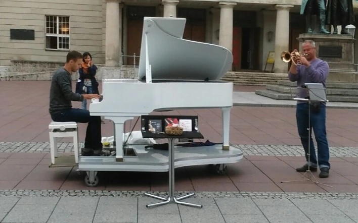 독일에서도 오가는 사람들이 많은 곳에서는 버스킹(Busking)을 하고 있는 장면을 자주 만나게 된다. 그런데 버스킹의 수단이 우리의 그것과는 조금 다른 면이 있다. 우리네 버스커(Busker)들이 주로 우리에게 익숙한 대중가요나 춤사위를 그 수단으로 삼는다면, 독일의 경우 (꼭은 아니지만) 클래식을 주된 수단으로 삼는다. 그리고 이를 위해 바이올린은 물론이고, 플루트나 트럼펫 등과 같은 관악기를 사용하기도 한다. 뿐만 아니라 아래 사진에서 보듯이 그랜드피아노까지 등장하기도 한다.