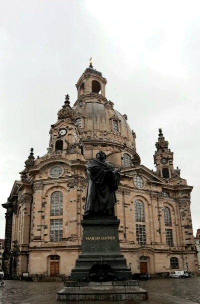 아, 후배 목사님의 글 중에 나오는 프라우엔키르헤는 2차 대전 중에 폭격으로 완전히 파괴되었는데, 엄격한 고증을 거쳐 그야말로 천문학적 비용을 들여 오랜 시간에 걸쳐 복구를 해서 이제는 과거의 모습을 온전히 되찾았다. 혹시 그 프라우엔키르헤의 모습을 보고 싶은 분이 계실지도 몰라서 한 장의 사진을 더 첨부한다. 교회 앞의 동상은 종교개혁의 기치를 높이 들어 올렸던 마틴 루터(Martin Luther, 1483~1546)의 동상이다.