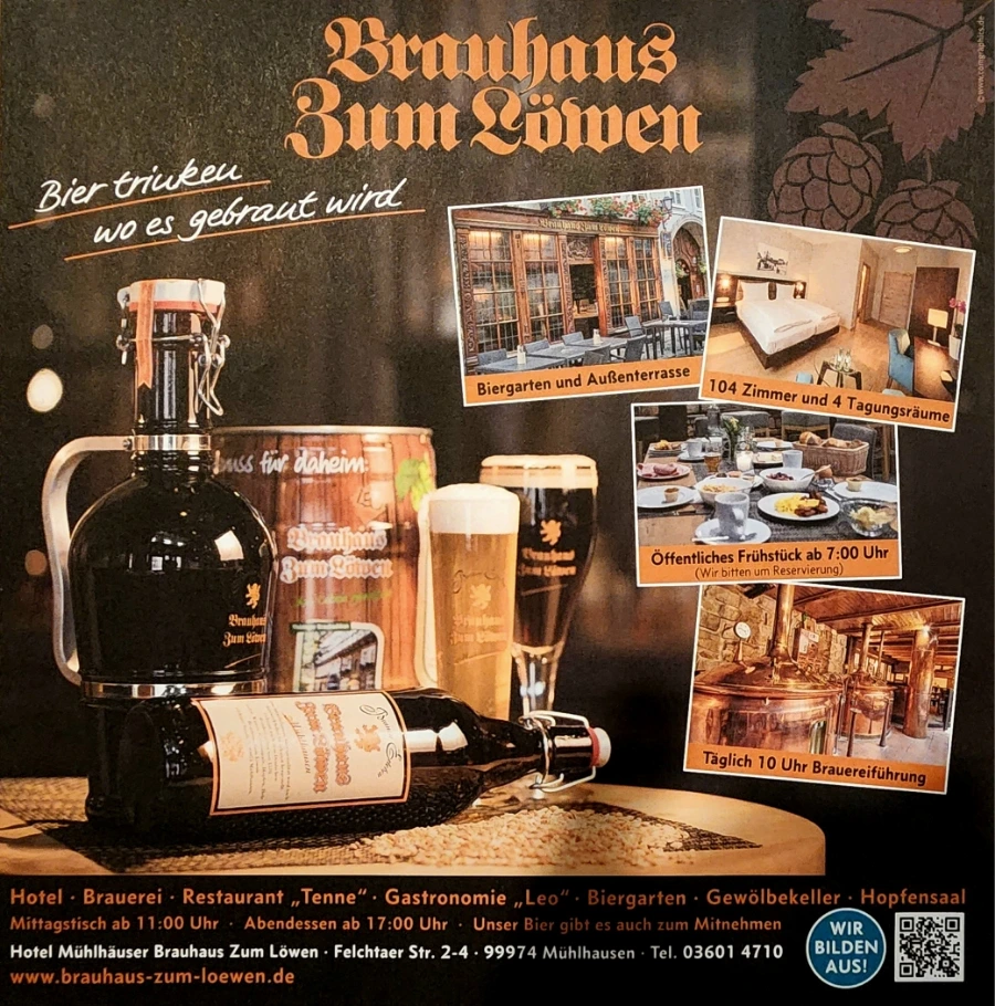 브아루하우스 줌 뢰벤은 뮐하우젠 시내 한복판에 있다. 뮐하우젠 관광에 나섰을 때 으레 들리기 마련인 "독일 농민전쟁(Deutscher Bauernkrieg)" 기념관 바로 앞에 있어 찾기도 쉽고. 아래 사진이 브라우하우스 줌 레벤의 노천 테이블인데, 그 뒤에 보이는 건물이 바로 독일 농민전쟁 기념관이다.