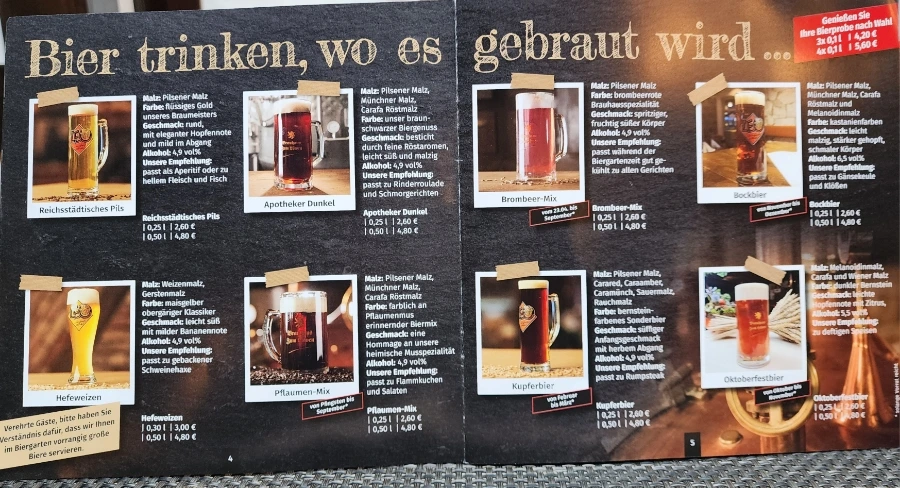 아, 앞에서 내가 마실 음료를 고르는 것이 힘들었다는 이야기를 했는데, 그 이야기를 듣고 왜 힘들었냐고 반문하시는 분이 있을지도 모르겠다. 독일 맥주라고 해봤자 우리가 흔히 마시는 독일 맥주의 전형 필스(Pils), 밀맥주인 바이젠(Weizen), 그리고 흑맥주(Dunkel) 정도가 전부인데...라면서 말이다. 그에 대한 답은 아래 사진으로 대신하기로 하겠다. 아래 사진에서 보듯이 이곳 브라우하우스 줌 뢰벤에서는 무려 8종류의 맥주가 서비스되고 있다.