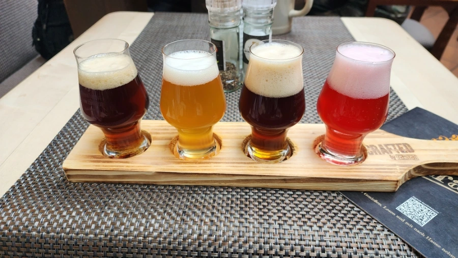 그런데, 정작 문제는 그 다음에 발생했다. 우리가 주문한 두가지 맥주가 너무 맛있었고, 이는 자연스레 다른 맥주를 맛보고 싶다는 생각을 갖게 만들었기 때문이야. 운전을 하며 독일을 누벼야 하는 나에게 고문과도 같은 시간이 흘러갔고, 결국 내 선택은 아쉽지만 여러 종류의 맥주를 조금씩 맛만 보는 것이었다. 그를 위해 플라우멘-믹스(Pflaumen-Mix), 바이젠, 쿠퍼비어(Kupferbier), 그리고 브롬베어-믹스(Brombeer-Mix) 조합의 테스터를 선택했다. 이것들이 어떤 것을 재료로 하는지는 저 위에서 보여주었던 사진을 참고하기를 비란다. 술을 그리 많이 마시지 않는 집사람은 브롬베어-믹스(가장 오른쪽의 것)에 완전 꽃혔다.