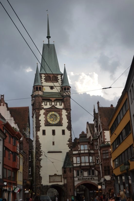 프리이부르크 수제 맥주집 가운데 술맛을 좀 안다는 사람들이 첫손가락에 꼽는 곳은 역시 마틴스 브로이(Martin's Bräu)인데, Bräu는 보통 양조장이 직영하는 술집을 말한다. 찾아가는 방법은 비교적 쉽다. 프라이부르크의 중심이 되는 곳은 베르톨스브룬넨(Bertoldsbrunnen)이라는 곳인데, 그곳에 서면 마틴스 토아(Martin's Tor)라는 커다란 문이 보인다. 아, 독일어에서 Tor는 문이란 뜻인데, Tor는 집의 방문 같은 것을 말하는 것이 아니라 아래 사진에서 보는 것처럼 성의 한 부분을 이루고, 어떤 도시로 들어가기 위해 반드시 거쳐야 되는 문을 말하는 것이 보통이다. 마틴스 토아는 프라이부르크 시의 상징이라고 하여도 전혀 과언이 아니라고 할 수 있는데, 그리하여 프라이부르크를 다녀간 사람들의 카메라에 예외 없이 그 모습이 담겨 있다. 그래, 아래 사진 속에 시계탑처럼 보이는 것이 바로 Martin's Tor이다.