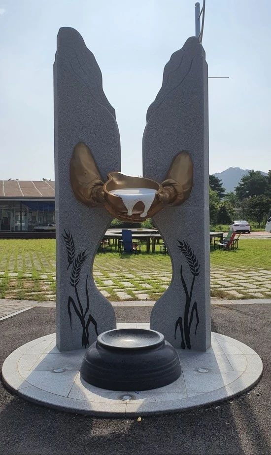 "한산 소곡주 갤러리" 앞에 넓은 광장이 있다. 테이블이 둥그렇게 배치되어 있고, 의자도 마련되어 있는 것으로 보아 틀림없이 한상에 둘러앉아 먹고 마시고 하는 곳으로 보인다. 그리고 그 앞으로 두 손으로 술잔을 움켜 쥔 모습의 조각작품이 있다. 술을 받은 것인지, 아님 (비록 뒤집어 있기는 하지만) 아래쪽의 검은 사발에 술을 부어주는 것인지...
