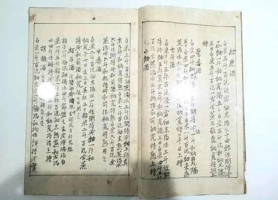 산림결제 중 소곡주에 관한 기록이 있는 부분은 이렇게 펼쳐져 전시되고 있는데, 오른쪽 페이지 맨 끝에 약간 두꺼운 글씨로 쓰인 '소곡주'라는 제목이 보인다. 그리고 왼쪽 페이지에 그에 관한 설명이 이어지고 있는데,