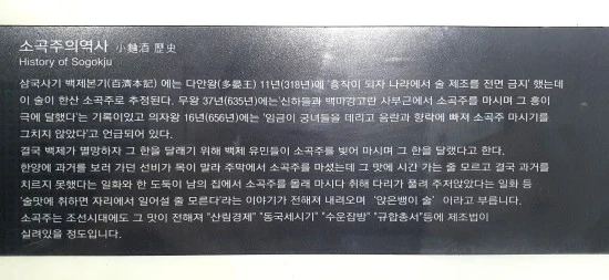 "한산 소곡주 갤러리"에 들어서면, 제일 먼저 "백제가 멸망한 이후 백제의 유민들이 망국(亡國)의 한을 소곡주로 달랬다"는 이야기와 만나게 된다.