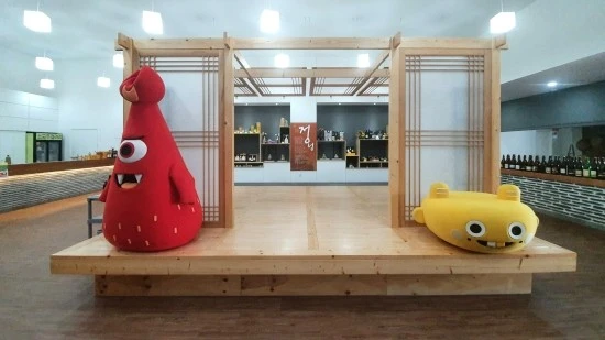 "한산 소곡주 갤러리" 한복판에는 이렇게 널찍한 평상(아니 사랑방인가?)이 만들어져 있다. 다른 분들 사진 중에는 자그마한 반상이 저 평상 가득히 놓여 있는 것이 있던데, 내가 찾았을 때에는 보다시피 휑했다. 앞쪽에 보이는 인형은 소곡주 마스코트인데, 왼쪽의 붉은 것은 '화비' 그리고 오른쪽의 노란 것은 '누룩'이란 이름을 갖고 있다. 누룩은 그 의미가 분명한데, 화비는 도대체 무슨 의미를 갖는 것인지 모르겠어. 관련기사 등을 검색해 보아도 이름만 소개되어 있고, 막상 그 의미는 설명이 없다. 인형 모양만을 보면 '화비'는 불도깨비가 아닐까 싶기는 하다.