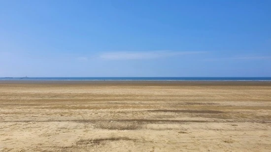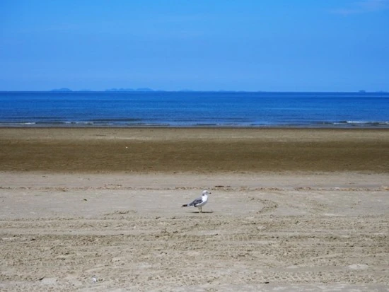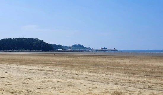 분수를 지나치면 바로 백사장이 펼쳐지는데, 춘장대 백사장은 보다시피 그 폭이 한없이 넓어서 백사장을 가로질러 물가에 이르기까지가 너무 힘들 정도이다. 어쨌거나 그 유명한 춘장대 백사장에 발을 들여놓았다. 백사장이 얼마나 넓은지, 지평선과 수평선이 서로 입맞춤이라도 하려는 듯 거의 맞닿아 있다.