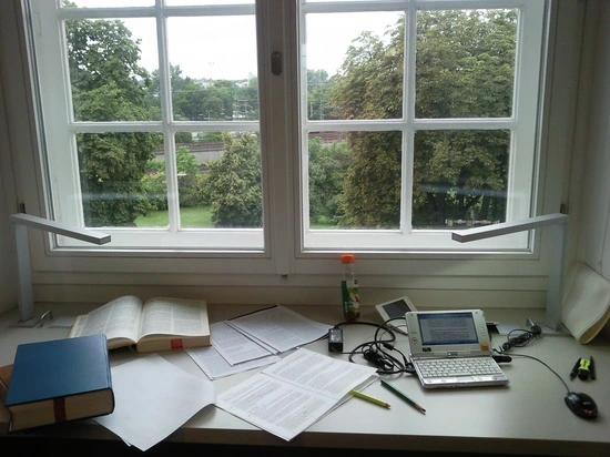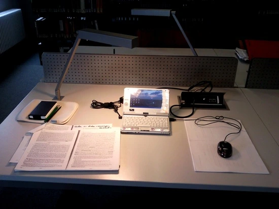 그런가 하면 열람실 안에 이렇게 창가 쪽으로 배치한 약간 특이한 모습의 책상도 존재하는데, 하나의 대학 도서관 열람실이 이렇게 사뭇 다른 모습으로 존재한다는 것이 조금은 낯설다. 그 이유는 만하임 대학이 옛날 이곳을 다스렸던 영주의 성이었던 곳을 대학의 캠퍼스로 사용하고 있는 것에서 찾을 수 있다. 즉, 옛날에 성안에 존재하던 여러 공간들을 그대로 살려 열람실로 꾸미는 과정에서 이렇게 다른 형태의 공간구성이 이루어진 것이다. 나는 개인적으로 이 공간을 훨씬 좋아했는데, 눈치챘겠지만 아래 사진 속에 보이는 모든 것들은 모두 나의 것이다. 노트북과 도난을 방지하기 위한 굵은 줄, 법률잡지, 복사물, 전자사전 등등