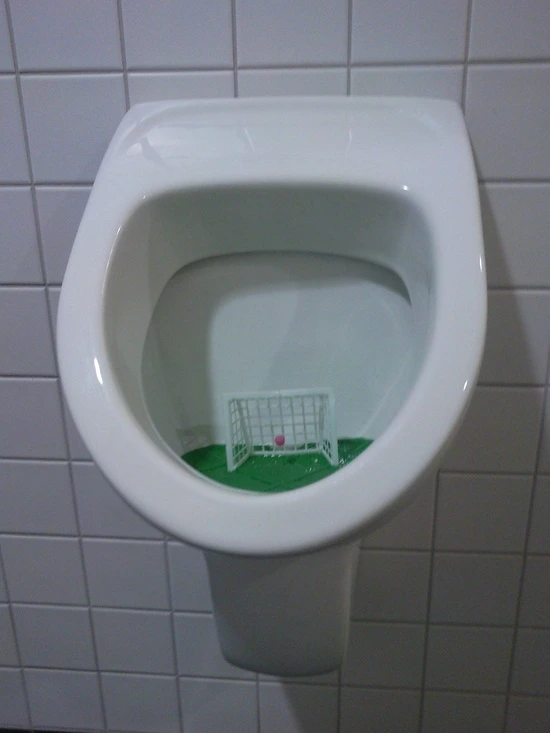 마지막으로 휴게실과 화장실인데, 이 둘을 동일한 카테고리로 묶어서 소개하는 이유는 둘 다 나름대로 쉬는 시간과 공간을 창출하는 기능을 갖고 있다고 생각하기 때문이다. 네덜란드의 스키폴(Schipol) 공항에서 시작되어 남성 소변기 주위의 청소비를 획기적으로 줄여준 것이 있는데, 바로 소변기 안에 파리 등과 같은 벌레 스티커를 붙여 놓은 것이다. 그리고 이것의 변형판은 상암월드컵 경기장 안에 있던 CGV Gold Class 화장실의 사격 과녁판이었다. 그런데 독일 친구들은 여기서 진일보하여 소변기 안에 급기야 축구 골대를 만들어 놓았다. 중앙에 붉은색 공이 소변 줄기가 닿으면 어찌할 줄 모르고 움직이게 되는데, 이것이 움직이지 않으면 나름 신경질이 나는 것을 보면 청소비를 줄이는 것에 기여할 것은 틀림없어 보인다.