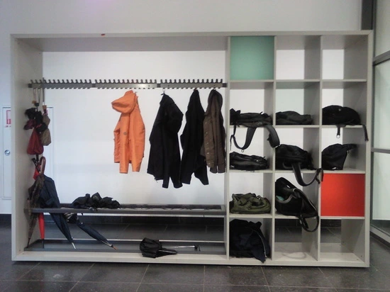 그렇다면 여기서 드는 의문점은 가져온 가방과 웃옷은 어떻게 해결하나?라는 것인데, 그것에 대해서는 아래의 2장의 사진이 답하고 있다. 먼저 이것은 누가 가져가도 괜찮다는 생각을 갖고 있는, 아니 가져갈 리 없을 것이라고 생각하는 학생들을 위한 가방과 옷의 보관대이다.