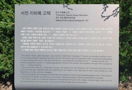 목은 이색이나 월남 이상재만큼의 전국적 지명도를 갖고 있지는 못하지만 서천을 빛낸 인물로 꼽기에 전혀 부끄럽지 않은 분으로 청암 이하복(靑庵 李夏馥, 1911~1987)이라는 분이 계신다. 이하복 선생은 한산 이씨로 이색 선생의 후손인데, 와세다 대학에서 경제학을 전공하고 보성전문(고려대학교의 전신)에서 교편을 잡으셨던 분이다. 사실 당신이 단순히 교수로서의 삶을 살아간 것에 그쳤다면 내가 당신에 관해 이렇게 이야기할 필요는 별로 없다. 그런데 이하복 선생은 그저 교수로서의 삶을 살다 가신 것이 아니라 말년에 자신의 전 재산을 팔아 학교를 짓는 등 교육사업에 헌신하셨다는 점에서 우리의 귀감이 되시기 때문에 당신을 이야기하고 있는 것이다. 한편 선생이 살았던 집은 옛 모습을 그대로 간직한 채 잘 보존되어 있어서 20세기 초중반 중부지방의 전통적인 농가의 모습을 연구하는 데 귀중한 자료가 되는데, 이번 글에서 이야기하는 "이하복 고택(李夏馥 古宅)" 이 바로 그것이다. 아, 이 같은 사료(史料)로서 가치를 인정받아서 이하복 고택은 국가민속문화재 제197호로 지정되어 보존되고 있다.