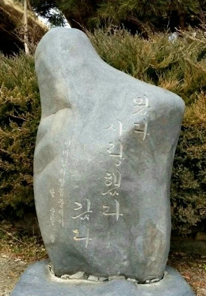 아랫 마당에 무언가가 나란히 줄지어 서있는 것을 볼 수 있는데, 가징 왼쪽에 있는 것은 이하복 선생의 유언을 돌에 새겨 넣은 비석으로 당신의 삶이 담백하게 잘 표현되어 있다. 이 세상을 뜰 때 마지막으로 남기신 말이 겨우 "왔다 갔다"라니... 아, 왔다가 가기 전까지 한 일은 "사랑했다"였네.