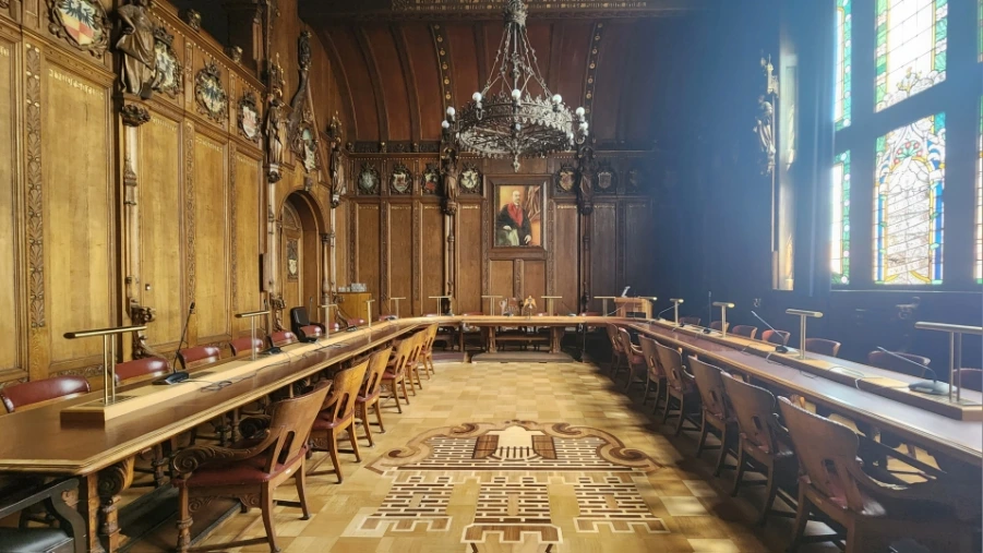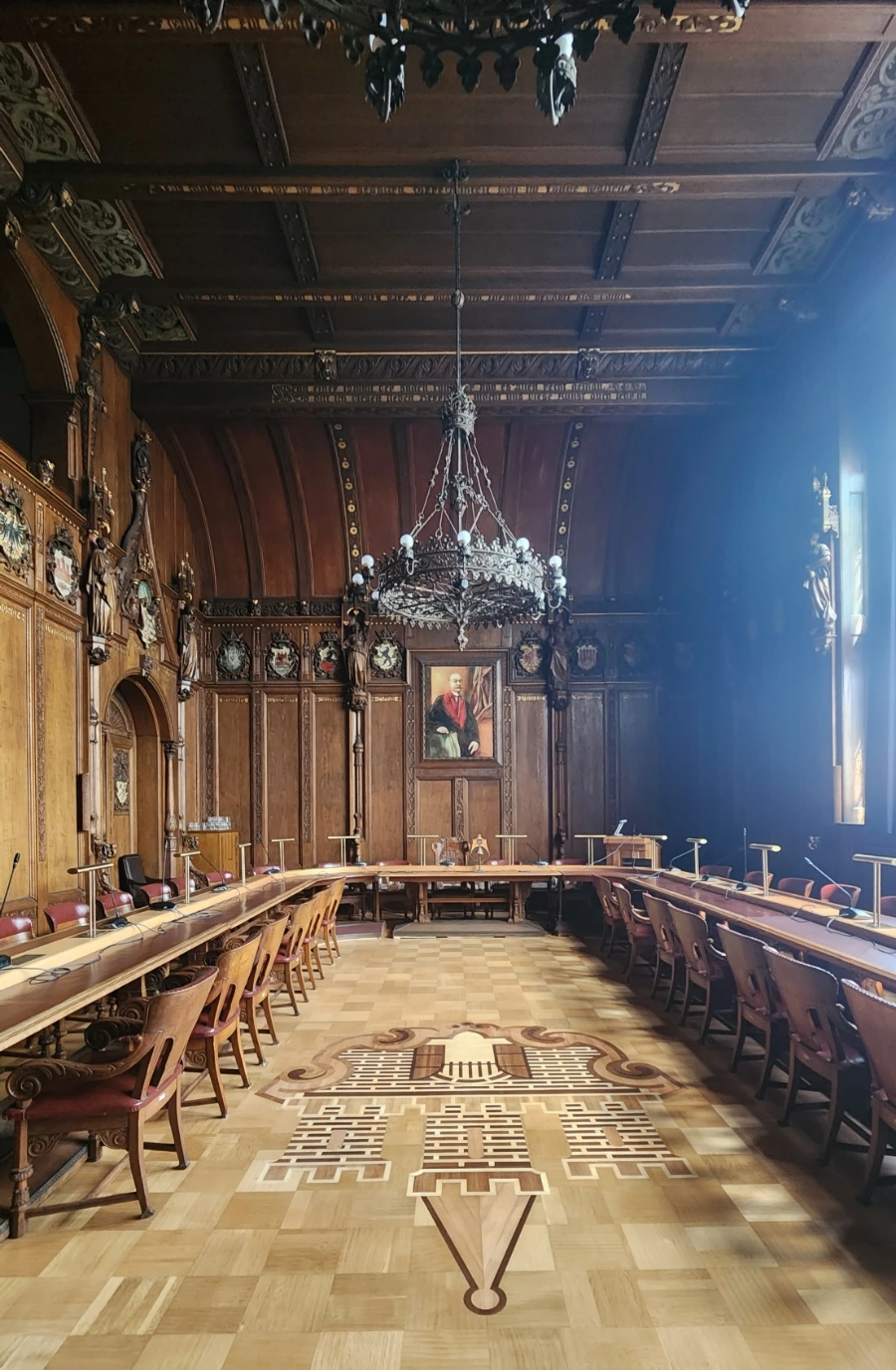 잠시호흡을 가다듬고 시선을 천천히 돌려보니 정면에 의장석이 보이고, 양옆으로 의원들의 자리가 마련되어 있다. 전체적으론 'ㄷ자'로 좌석이 배치되어 있다. 나무로 만들어진 벽에는 도시의 문장(紋章)을 비롯한 나무조각들이 연이어져 있고, 바닥에는 쾨텐시의 문장이 표현되어 있는 고급스러운 쪽마루가 깔려 있다. 천장에 매달려 있는 샹들리에 또한 멋있는데, 이것들이 모두 이 시청사를 지을 때부터 있었던 오리지날이라고 한다. 아, 그리고 이곳은 지금도 시의회가 열리는 장소로 사용되고 있다고.